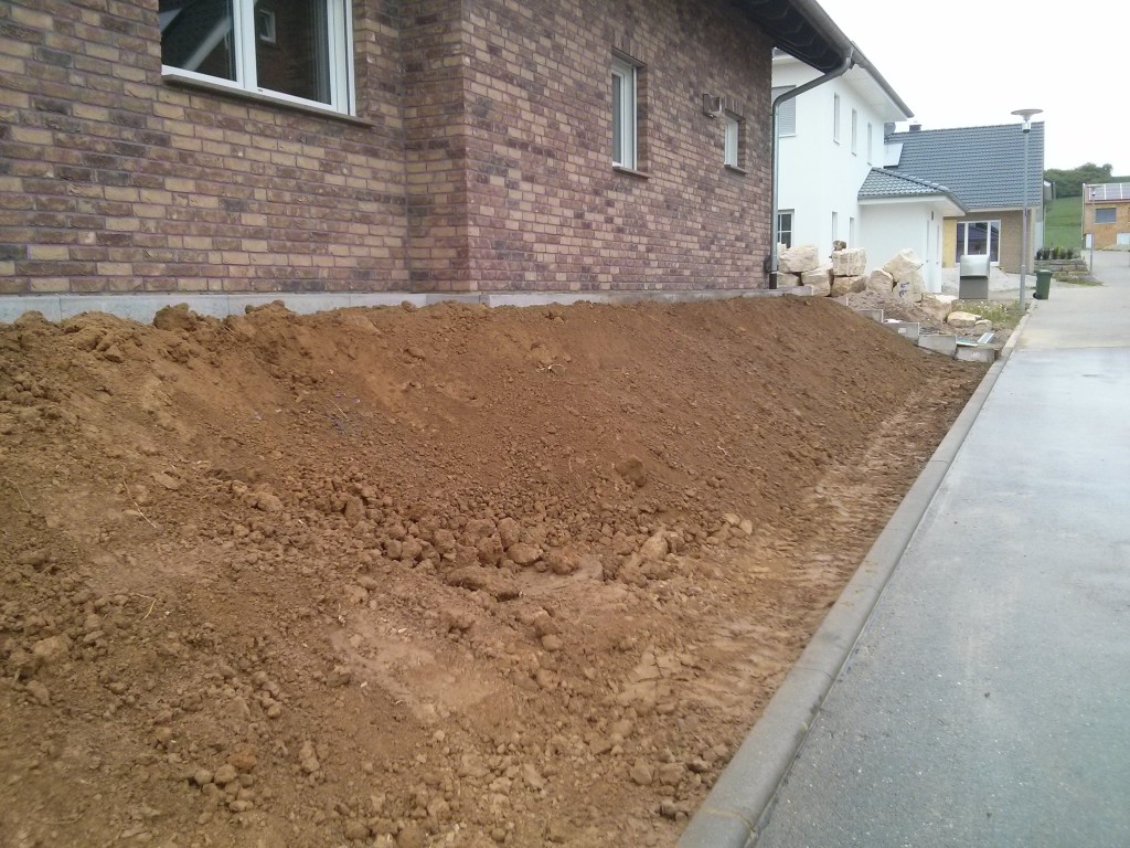 Nächster Punkt ist der „Garten“ vor dem Haus. Wobei „Garten“ stark übertrieben ist. Es ist ein ca. 3m breiter Streifen miit ordentlichem Gefälle zur Straße hin der später mal gepflanzt werden soll. Rasen wäre mit lieber gewesen, aber bei dem Gefälle ist Rasenmähen nicht so prickelnd: