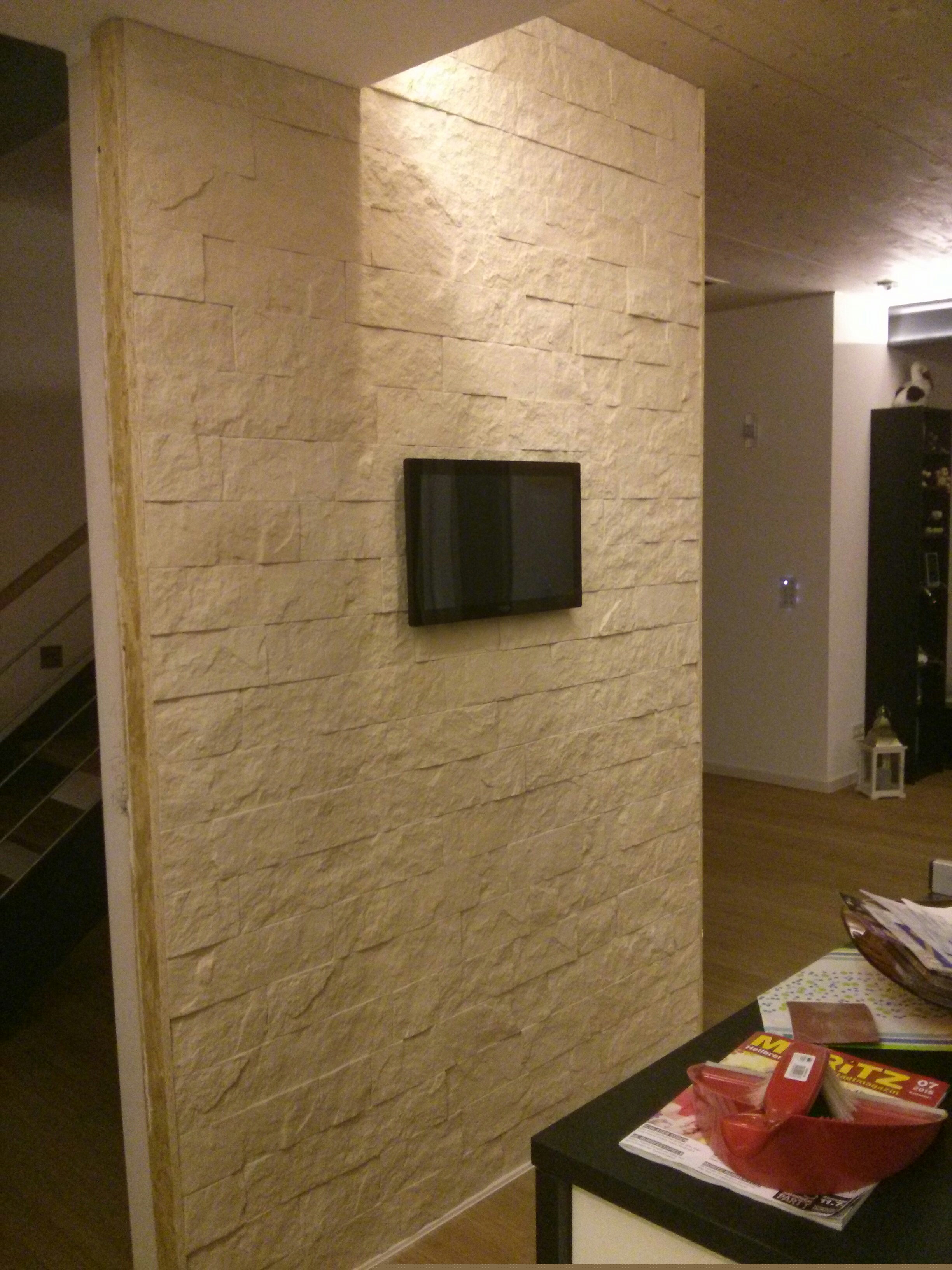 Die Verkleidung der Wand erfolgt dann mit einem „Kunststein“, gefertigt aus Gips. Naturstein wäre mir zwar lieber gewesen (weil resistenter gegen Macken, Flecken, …), aber zu, einen war das für uns nicht bezahlbar, und zum anderen waren die meisten Formen so klein, dass einzelne Steinchen auf einem Netz aufgeklebt sind und man mehrere Netze wie ein Puzzle ineinander stecken/kleben muss. Durch die schräg aufgeklebten Steinchen hätte man dann die einzelnen Elemente gesehen. Und das wollten wir nicht.