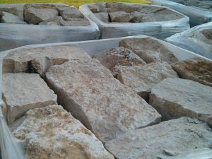 10 Paletten mit 1,2 bis 1,8 Tonnen standen dann Ende 06/2016 bei uns in der Einfahrt. Steine im Format ca. LBH 15..40 x 15 x 15 cm, grob behauen. Gewicht im Schnitt pro Stein um die 25kg. Also durchaus „von Hand versetzbar“. Aber was ist mit den Stufen für die Gartentreppe? Nun, rund 110kg pro Blockstufe bei 11 Stufen… Da war die Diskussion: „Wie setzt man die?“ … Nun, des Rätsels Lösung: Muskelkraft und Stufensetzzange. Die gab es für ’nen 10er pro Tag zum Leihen im nächstgelegenen Bauschienenverleih.